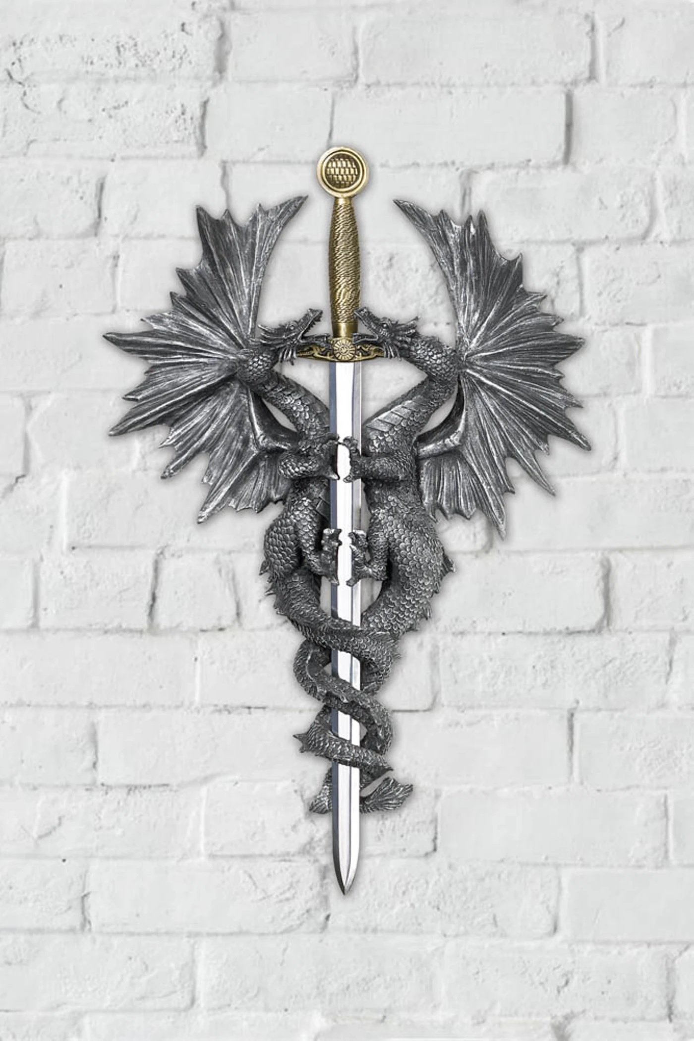• An impressive display of medieval mythology, as a pair of dragons entwine around a formidable dagger. Turn any room into a medieval fantasy castle with this mythical wall decor!
