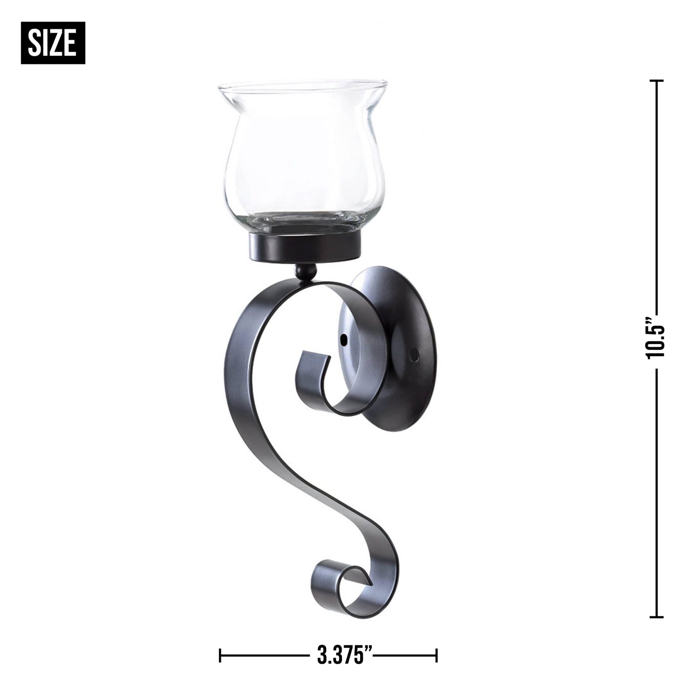 • The wall sconce weighs 0.8 lbs. and measures 3.38 inches by 3.75 inches by 10.5 inches. Glass holder: 3 3/8" x 3 3/8" x 3 1/2" high.