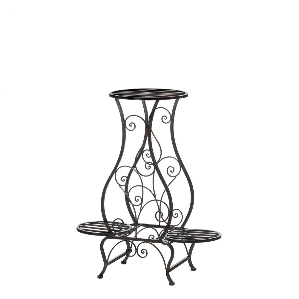 • Display your blooming beauties on a plant stand that's just as lovely as they are! This iron stand features three slatted platforms and an alluring hourglass shape with curling iron embellishments crawling up the center. The two lower platforms hold smaller pots, while the top center platform can hold your proudest plant.