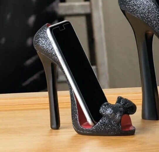 • High fashion is calling! This high heel phone holder is the most stylish way to keep your phone safe and easy to reach on your table or counter. The black shoe features a big bow, open toe, and sky-high heel.