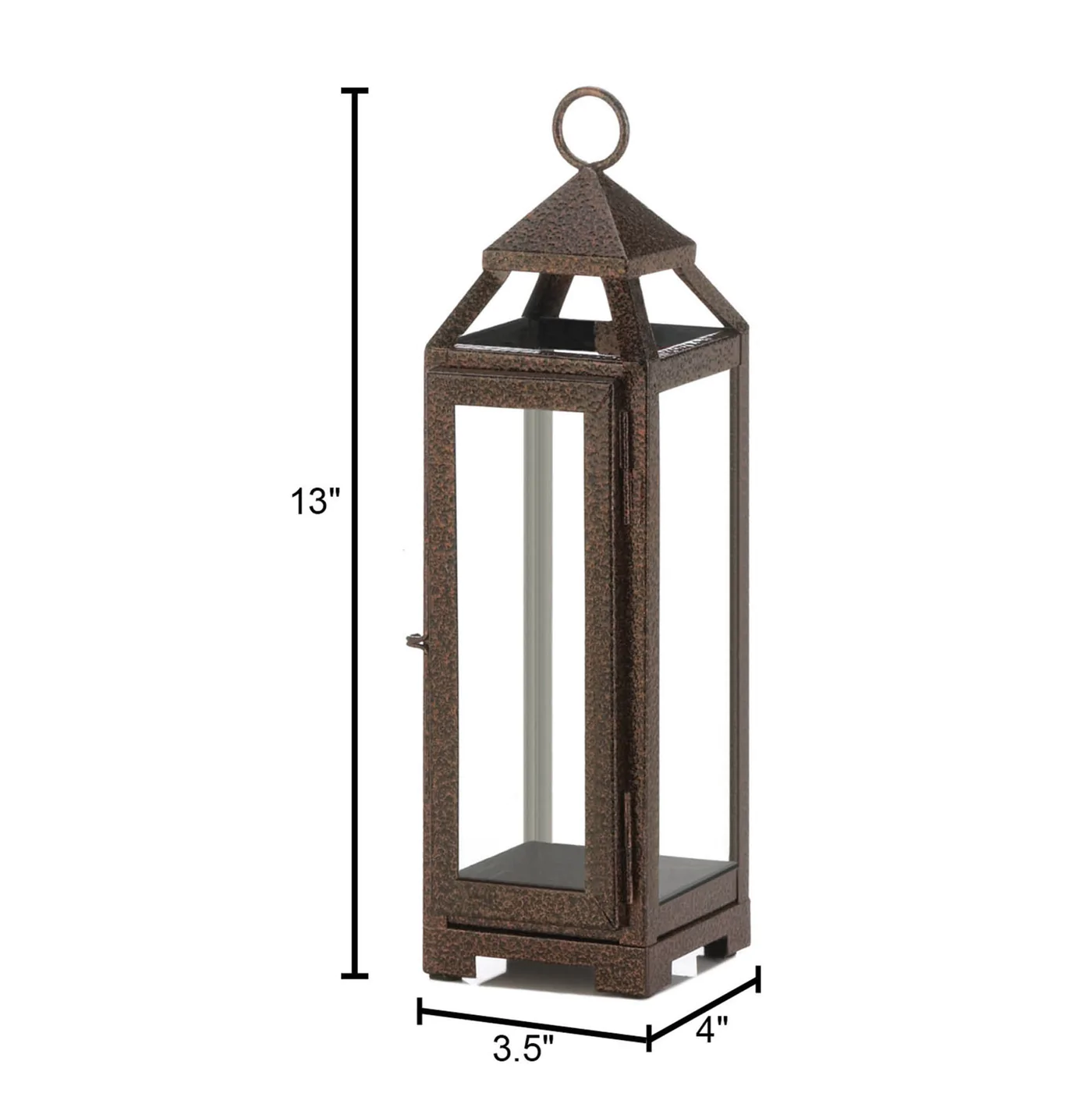 • Perfect for rustic décor, this small copper lantern will add a charming look to your indoor or outdoor space. This lantern is made with an iron frame in a speckled copper finish and encased with glass window panes. Place a pillar candle inside to illuminate your space in a soft and cozy glow.