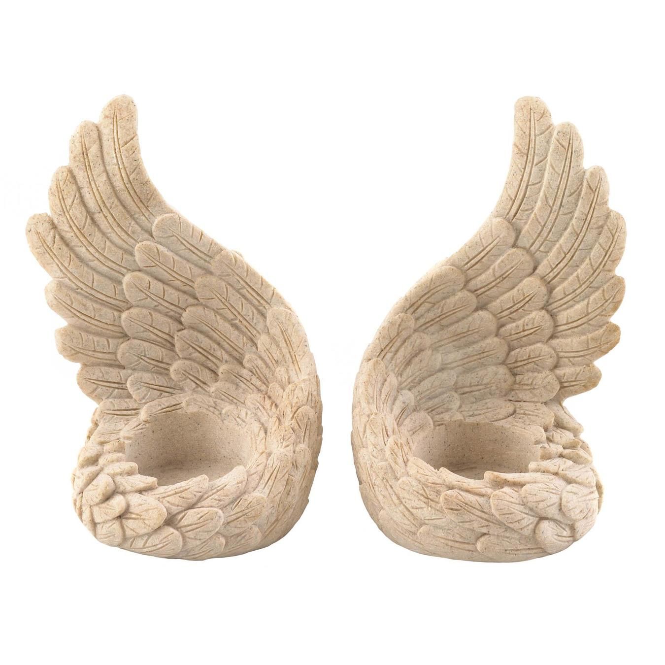 • Place tealights in this beautifully detailed holder of two angle wings. Let the soft glow of LED candles or a real candle set the stage for a peaceful night at home. Place on a mantel, as a centerpiece, or a table surface to create ambiance in your space