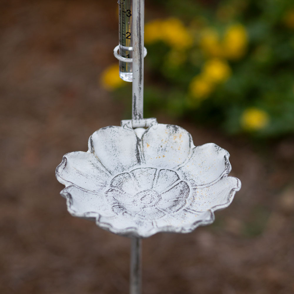 Our Leapfrog Rain Gauge Includes a birdseed dish and a clear plastic gauge that measures up to 5'' of rainwater. This item breaks down for easy shipping and storage.