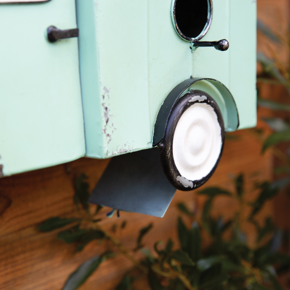 Add a little whimsy to your garden fence with this cute Piaggio birdhouse. It hangs using keyhole hangers in the back and has a cleanout door hidden on the bottom with a latch closure.